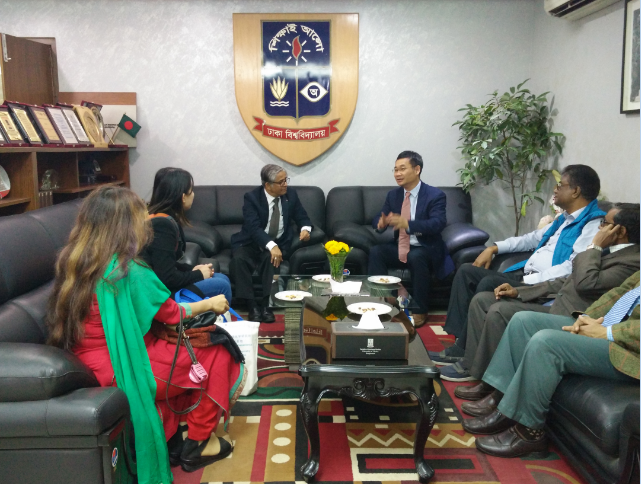 At the invitation of the University of Dhaka (DU), Bangladesh, a delegation of three led by Professor Gan Zhang, Deputy Director-general of the Guangzhou Institute of Geochemistry, the Chinese Academy of Sciences (GIGCAS), visited Bangladesh from January 29th to 31st. An MoA was signed between GIGCAS and DU during the visit.
