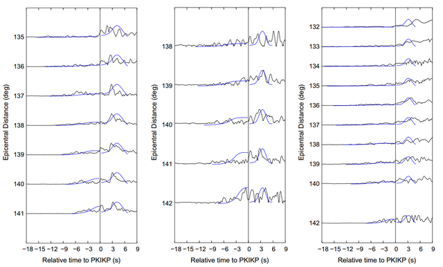 Figure 2. Observed (black) and synthetic (blue) PKP precursor envelopes for three representative events in three regions. (Image by SUN Xinlei)