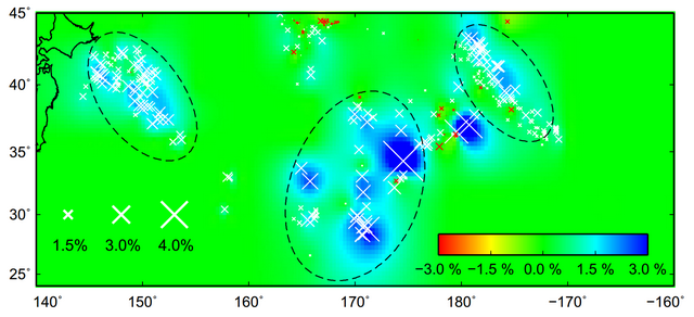 To solve this problem, Prof. SUN Xinlei and his student Xiaolong Ma, together with other co-authors, used an unconventional phase, PKP precursors that diffracted from CMB. They analyze PKP precursors from earthquakes in the Aleutian Islands and Kamchatka Peninsula recorded by seismic arrays in Antarctica, and find that these seismic heterogeneities extend 400 km above the CMB and are distributed between 30° and 45°N in latitude. Of particular interest, the scatterers show the largest P-wave velocity perturbation of 1.0–1.2% in the center (160°–180°E) and 0.5% to the west and east (140°–160°E, 180°–200°E) (Figure 2). ScS–S differential travel-time residuals show similar trends: the middle and the two sides have S velocity variations of about 2.0–3.0% and 1.0–1.5%, respectively (Figure 3). The authors suggest that these seismic scatterers are the remnants of ancient subducted slab material. The lateral variations may be caused either by different slabs, or by variations in slab composition resulting from their segregation process.