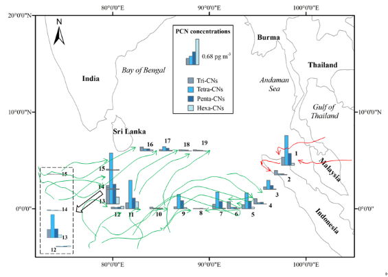 Polychlorinated naphthalenes (PCNs) are defined as persistent organic pollutants (POPs) because of their persistence, long-range transportability, bioaccumulation, and adverse effects on organisms. Technical PCN products had been widely used as insulators, lubricants, flame retardants, paint additives and so on. As technical PCN products has been phased out, atmospheric PCNs are contributed by reemission of synthetic PCNs once deposit onto soil, vegetation, seawater and ice, as well as unintentional emission from combustion processes such as municipal waste incineration, smelting and coking. The oceans are so huge that they receive massive PCNs originating from lands. However, air-seawater exchange is a reversible process. Thus, oceans may release PCNs, which could return to terrestrial environment following air masses moving from ocean to land. Knowledge on pollution of PCNs in the oceans, their sources and fate is scarce, so that there is a lack of understanding of the fate of PCNs in the ocean in a regional or global scale.