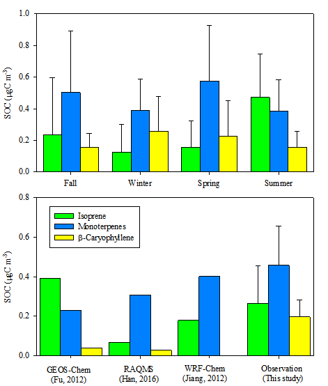 The scientists at Guangzhou Institute of Geochemistry, Chinese Academy of Sciences (GIGCAS) discover that BB causes unexpected increases of terpenoids SOA in autumn-winter over China. Based on a one-year concurrent observation of terpenoids SOA tracers at 12 sites across 6 regions of China, they find that the spatiotemporal trends of isoprene and monoterpenes SOA in spring-summer are indeed consistent with the prediction of MEGAN parameters, suggesting the majority of biogenic emissions for isoprene and monoterpenes then. However, unexpected increases of terpenoids SOA in autumn-winter cannot be explained by MEGAN parameters. The positive correlations between terpenoids SOA tracers and the BB tracer, levoglucosan in autumn-winter indicate that the unexpected increases of terpenoids SOA are highly associated with the enhancement of BB (Figure 1). Source apportionment results implicate that the composition of terpenoids SOA dramatically changes from a monoterpene majority in fall-spring to an isoprene majority in summer, which cannot fully predicted by current modeling studies (Figure 2). These findings highlight the importance of terpenoids emissions from BB and provide new insight into the sources of terpenoids SOA. These results have been published in Journal of Geophysical Research: Atmospheres and Scientific Reports.