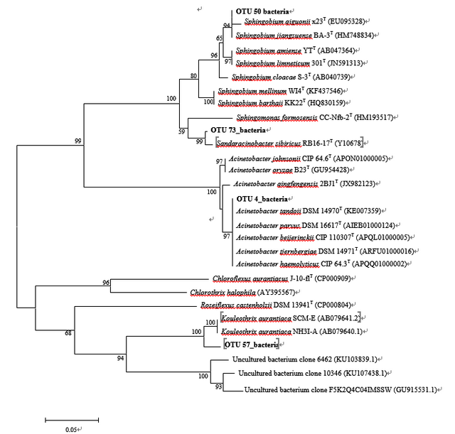 Figure 2 Phylogenetic tree of identified OTUs (OTU_4, OTU_50, OTU_73 and OTU_57) responsible for PHE degradation.(Image by LUO Chunling)