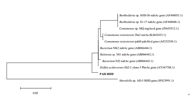 Figure 3 Phylogenetic analysis of amplified PAH-RHDα GN gene based on the amino acid sequences from heavy fraction in 13C-PHE microcosm. (Image by LUO Chunling)