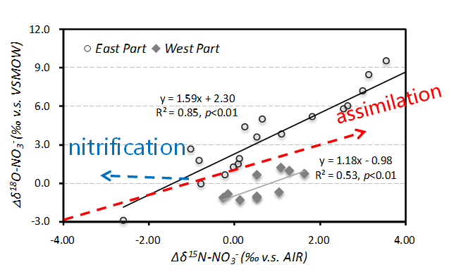 (1) High δ15N values of nitrate at low salinities indicate that sewage is a significant source of nitrate, up to 19% as calculated from a two end-member mixing model. Simultaneous nitrate assimilation by phytoplankton and nitrification occurred within the estuary. Higher degree of nitrification was found in the east PRE than the west PRE, most likely due to different water velocities and residence time in the two areas.