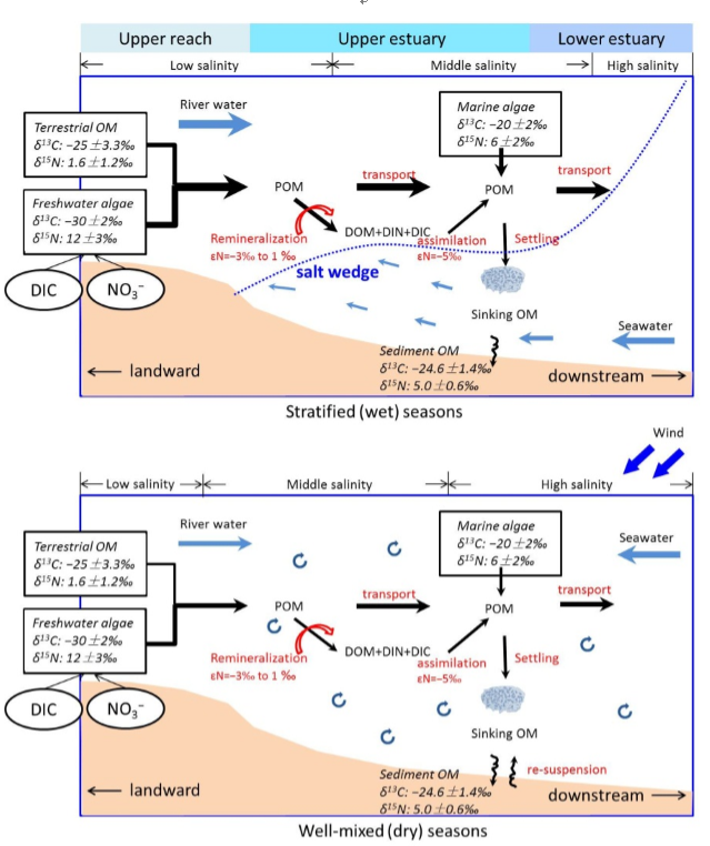(3) The isotopic ratios of particulate organic matter (POM) follow seasonal climatic and hydrological cycles well, which were in turn controlled by river discharge and temperature-modulated biological processes (i.e., assimilation and remineralization). Terrestrial OM and freshwater phytoplankton were the major components of POM within the estuary and shelf areas, whereas marine phytoplankton was the dominant component in the adjacent coastal water with mid-salinities. This pattern indicates that seasonal flooding has a profound effect on material dynamics in coastal regions.