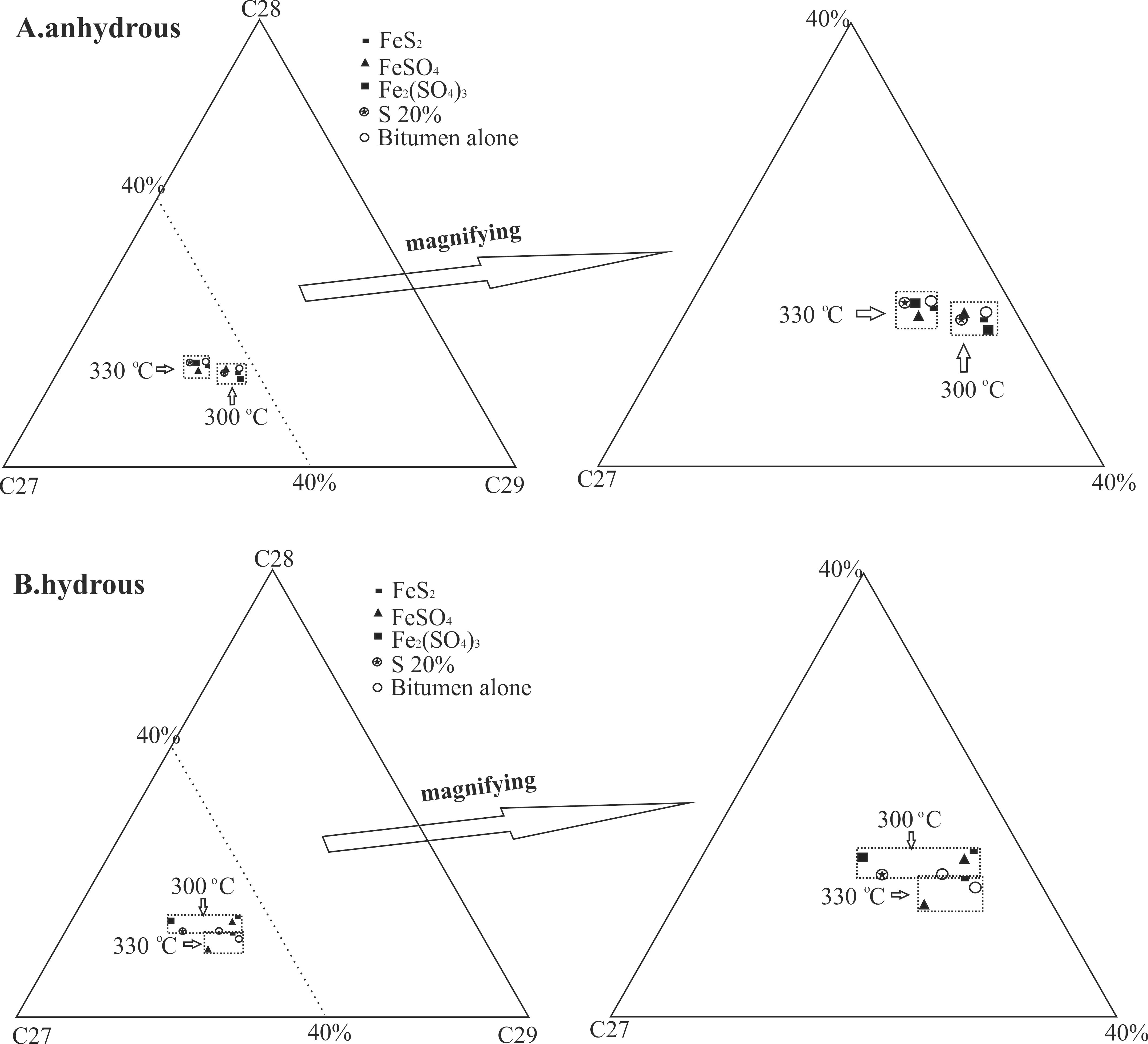 In their study, a bitumen with abundant biomarkers was pyrolyzed (under both hydrous and anhydrous conditions) with elemental sulfur and sulfur bearing minerals (including FeS2, FeSO4, and Fe2(SO4)3) at various temperatures. The absolute concentrations and the distributions of biomarkers in the above thermal altered bitumens were compared and discussed. The results show that effects of different forms of sulfur on the evolution of biomarkers vary. FeS2 (pyrite) almost does not influence the characteristic of biomarkers while SO2- 4 (FeSO4 and Fe2(SO4)3) and S0 have significantly effects on the characteristic of biomarkers during oil-generative windows under both hydrous and anhydrous conditions. Their extent of thermal alteration of biomarkers are decreased by the following order: S0 > Fe2(SO4)3 > FeSO4 > FeS2. Additionally, the presence of water seems to promote the influence of different forms of sulfur on the evolution of biomarkers but do not change their influence order. Meanwhile, the influence of elemental sulfur on biomarkers will also increase with the maturity and the relative abundance to TOC. It implies that the pyrolysis of bulk source rock powders is considered to be more reprehensive than the pyrolysis of kerogen, as the influence of mineral compositions (both clay minerals and sulfur-bearing minerals) can be considered. However, kerogen with the removal of sulfur compounds is more suitable for the study of the thermal maturation of OMs.