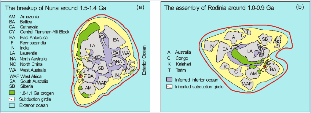 Two Proterozoic supercontinents, Nuna (or Columbia, 2.0–1.6 Ga) and Rodinia (1.0–0.9 Ga), have widely attracted the attention of the geological community. However, it remains controversial regarding how Nuna broke up into fragments and how these fragments subsequently re-amalgamated into Rodinia supercontinent.