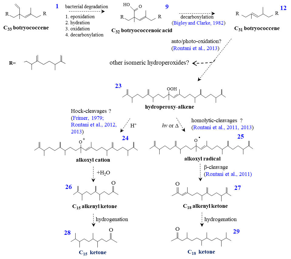 ② In the above mentioned diagenetic pathway, as the final intermediate product, the internal double bond of the C31-botryococcene (12) had easily and preferentially undergone the abiotic degradation (photo-oxidation and autoxidation), as a result, firstly produce hydroperoxide (23) and subsequent C15- and C18-alkenyl ketones (26,27) due to Hock cleavages and Homolytic cleavages (Fig. 3). Finally, the identified C15-, C18-ketones (28,29) can be available by diagenetic hydrogenation.