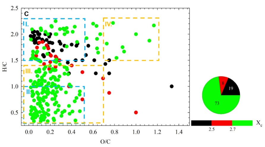 Figure 1: The van Krevelen graph for the CHO, CHON, and CHOS groups of compounds, formed upon dark heterogeneous reaction of o-VL in presence of NO3- (Ieff = 0.32M). The color-coding indicates the calculated DBE values. The aromaticity equivalent (black with Xc < 2.5, red with 2.5 ≤ Xc < 2.7, and green with Xc ≥ 2.7) follows the color bar, while the pie chart shows the percentage value of each color-coded group in the sample. See Wang et al., 2021 for the description of regions I to IV.