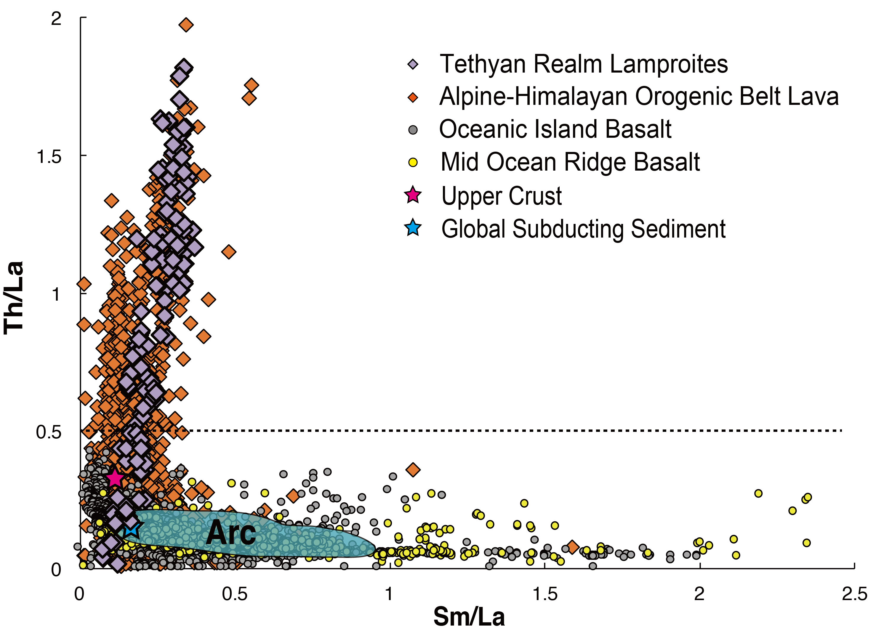 The Th/La ratio has been used to assess whether certain chemical features shared by arc magmas and continental crust are induced by subduction processes or are derived from recycled subducted sediment. In normal circumstances the Th/La ratio of mantle-derived magmas should be relatively constant and no greater than 0.5. However, post-collisional lamproites of the “Tethyan-realm”, which later developed into the Alpine-Himalayan Orogenic Belt (AHOB), were reported to have high Th/La ratios of up to 2.2. Given their exceptional enrichment in potassium and other strongly incompatible elements, lamproites have been considered the optimal probe to characterize strongly metasomatised mantle to constrain the source of the Alpine-Himalayan orogenic magmatism. The unusual geochemical signature of extremely high Th/La coupled with relatively low Sm/La is not restricted to lamproites in the Alpine-Himalayan orogenic belt, but also occurs in many other potassium-rich volcanic rocks in the same belt (Fig. 1). Two main mechanisms have been put forward to explain this anomalously high Th/La: [1] preferential uptake of La relative to Th in mafic minerals during direct melting of continental crust; and [2] melting of mélanges that include lawsonite/zoisite-bearing blueschists accreted to the colliding continental plates.
