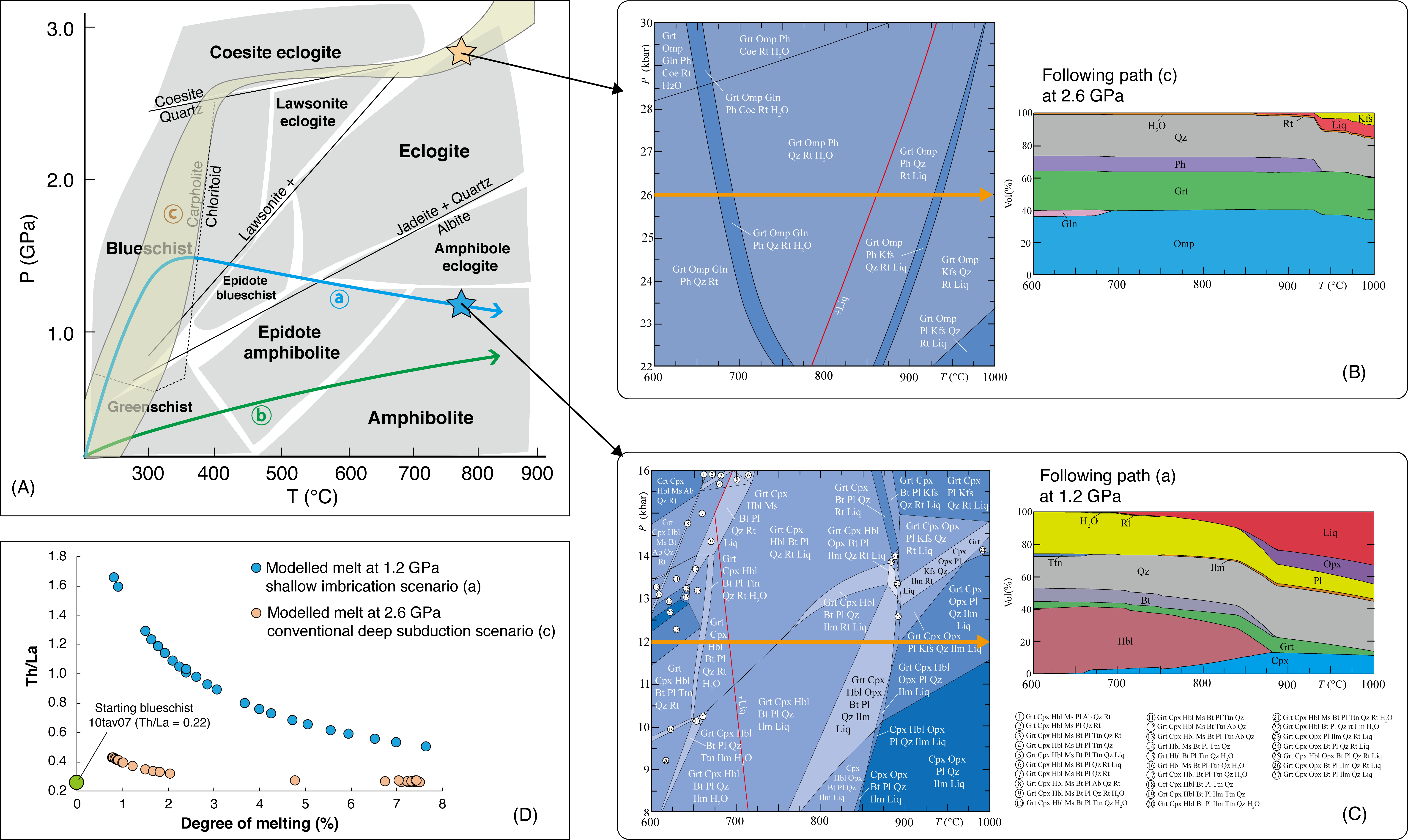 Fig. 2 Deep subduction vs. shallow imbrication. (A) Three contrasting prograde P-T-t paths for (a) shallow subduction and tectonic imbrication discussed for the Alpine-Himalayan Belt (blue line), (b) normal regional (orogenic) metamorphic scenario (green line) and (c) conventional deep Andean-style subduction [beige shaded field]. During subduction, path (a) reaches blueschist facies, and tectonic imbrication may store abundant blueschists in the lithosphere. This material is now removed from the subduction environment and is isolated from further movements. During post-collisional processes, these rocks slowly heat up (path a) and move slowly from blueschist, through epidote amphibolite to upper amphibolite facies. In contrast, path (b) follows a path from greenschist to epidote amphibolite then to amphibolite. but does not pass through the blueschist facies. (B-C) Full pressure-temperature (P-T) pseudosection diagrams for the Tavs?anl? blueschist 10tav07 at 600-1000℃, 0.8-1.6 GPa and 2.2-3.0 GPa following path a and c in (A), respectively. Also shown are calculated modal proportions for melting along apparent pressure of 1.2 GPa and 2.6 GPa. Plots of modal proportions vs. temperature (also known as modebox diagrams) illustrate the changing abundance of phases, modelled along linear pressure of 1.2 GPa and 2.6 GPa (orange lines with arrow). (D) Comparison between modelled Th/La ratios for melts produced at 1.2 GPa (shallow imbrication scenario) and melts produced at 2.6 GPa (conventional deep subduction scenario) at given degree of melting. Starting Th/La in blueschist 10tav07 is 0.22, many blueschists have higher ratios. Note the striking difference of Th/La ratios between the two types of modelled melts. Grt, garnet; omp, omphacite; gln, glaucophane; ph, phengite; coe, coesite; qz, quartz; rt, rutile; kfs, K-feldspar; pl, plagioclase; liq, melt; cpx, clinopyroxene; opx, orthopyroxene; hbl, hornblende; ttn, titanite; bt, biotite; ilm, ilmenite; ms, muscovite; ab, albite.