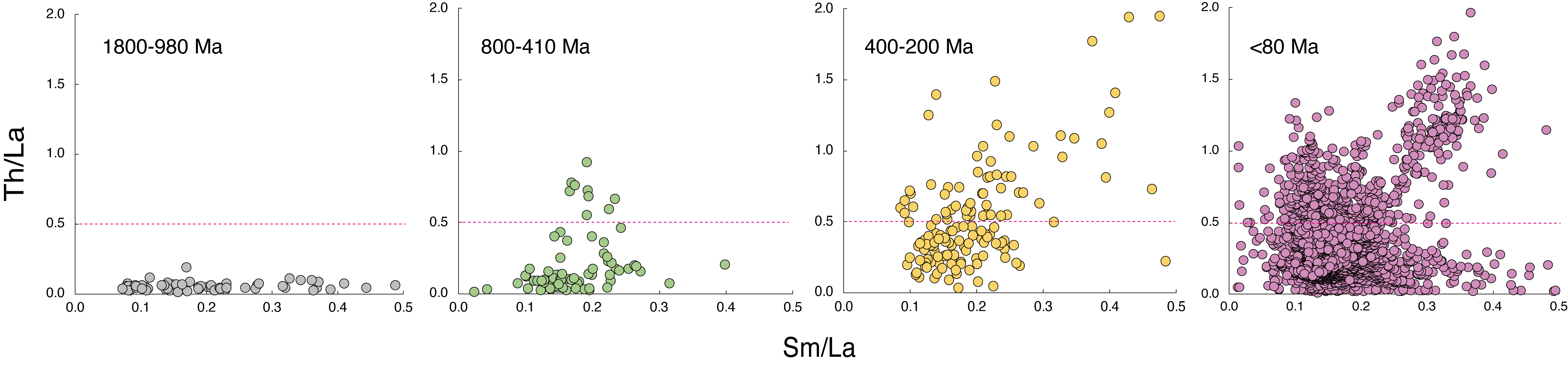 Fig. 3. Temporal variation in Sm/La vs. Th/La of potassium-rich orogenic volcanics through time. From <80 Ma (Alpine-Himalayan orogen), 200-400 Ma (South China, Central Asian and Variscan orogens), 410-800 Ma (Appalachian, Caledonide, Brasiliano and Pan-African orogens) to 980-1800 Ma (Grenvillian and Svecofennian orogens). Note there is a clear secular trend of increasing Th/La ratio through time where no elevated Th/La present for Grenvillian and Svecofennian times.