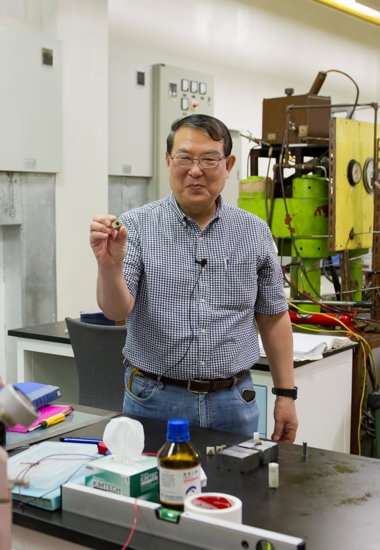 Takahashi shows in his hand the high-pressure assembly: MgO octahedral pressure medium.
