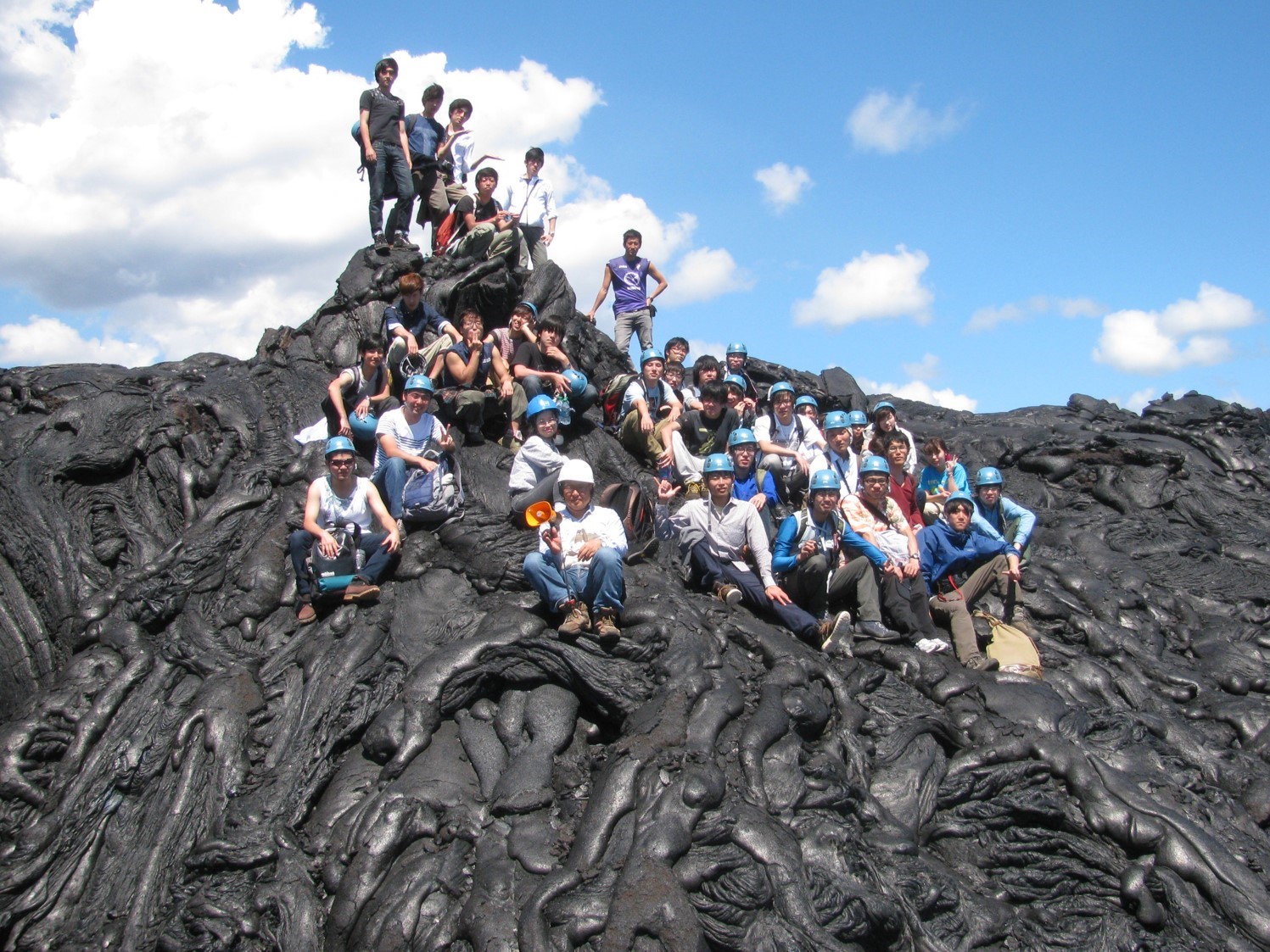 Takahashi (the one holding an orange loudspeaker at the center in the front row) takes undergraduates on a field trip to Hawaii for investigating lava.